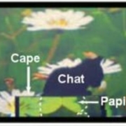d) Le chat s’est installé dans la cape. On remarque l’image du papillon transmis par la cape comme à travers le corps du chat. Les lignes pointillées blanches indiquent